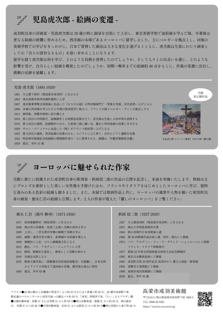 そのほか、本展では新たに収蔵された成羽町出身の作家・秋岡信二郎の絵画や彫刻と共に、当館所蔵の徳永仁臣の絵画作品を展示します。フランスやイタリアなど、ヨーロッパに魅せられた2人の作家の共演をお楽しみ下さい。